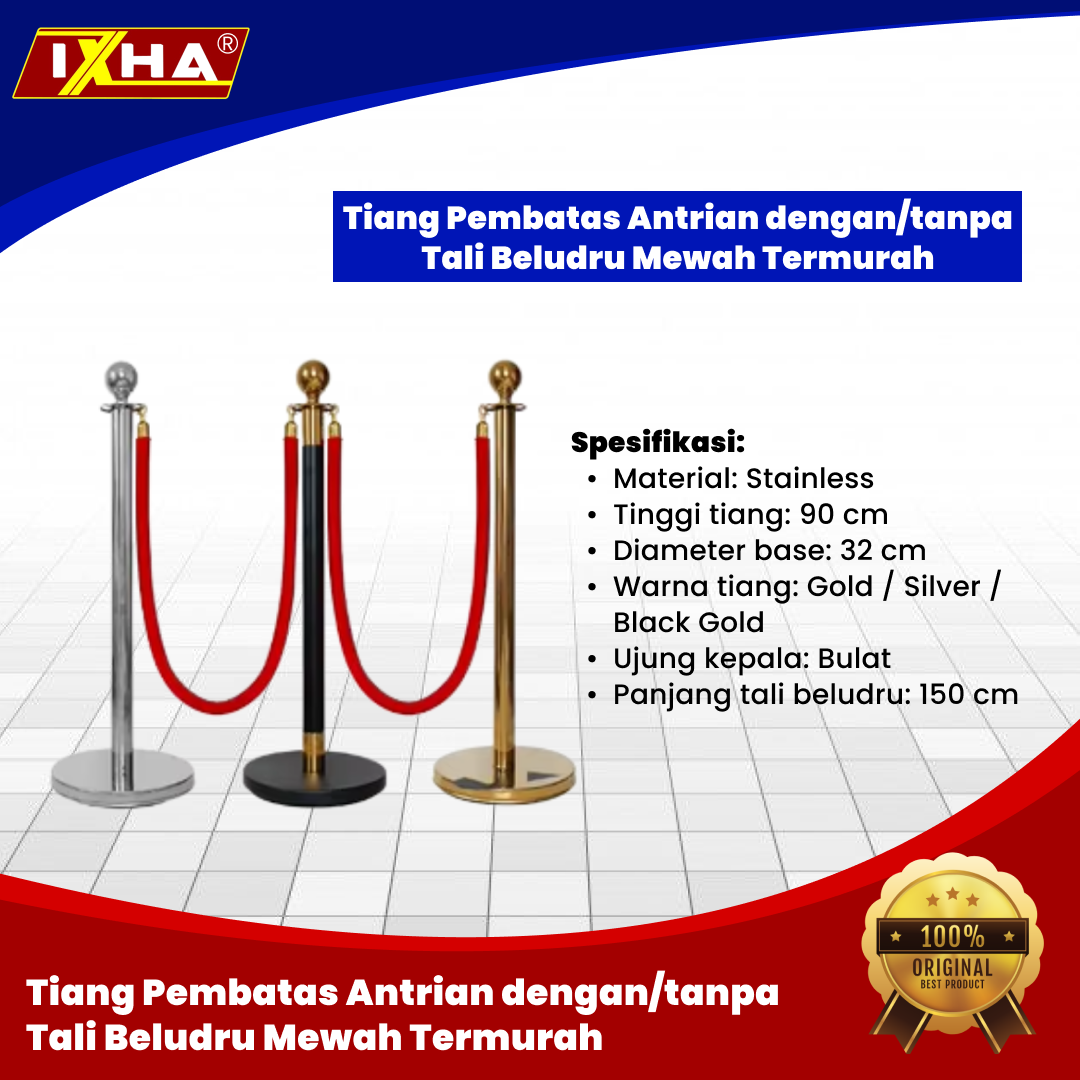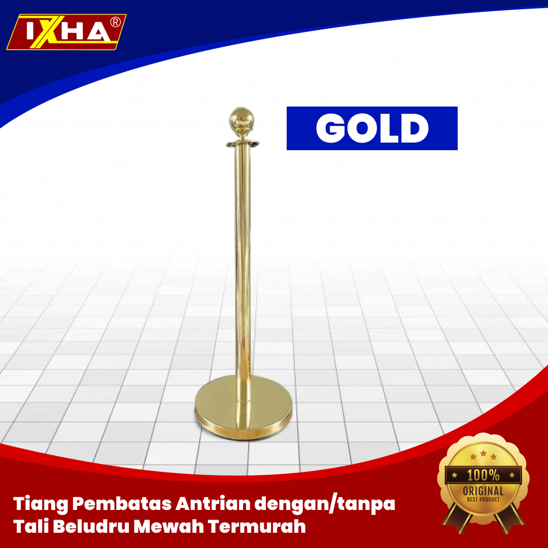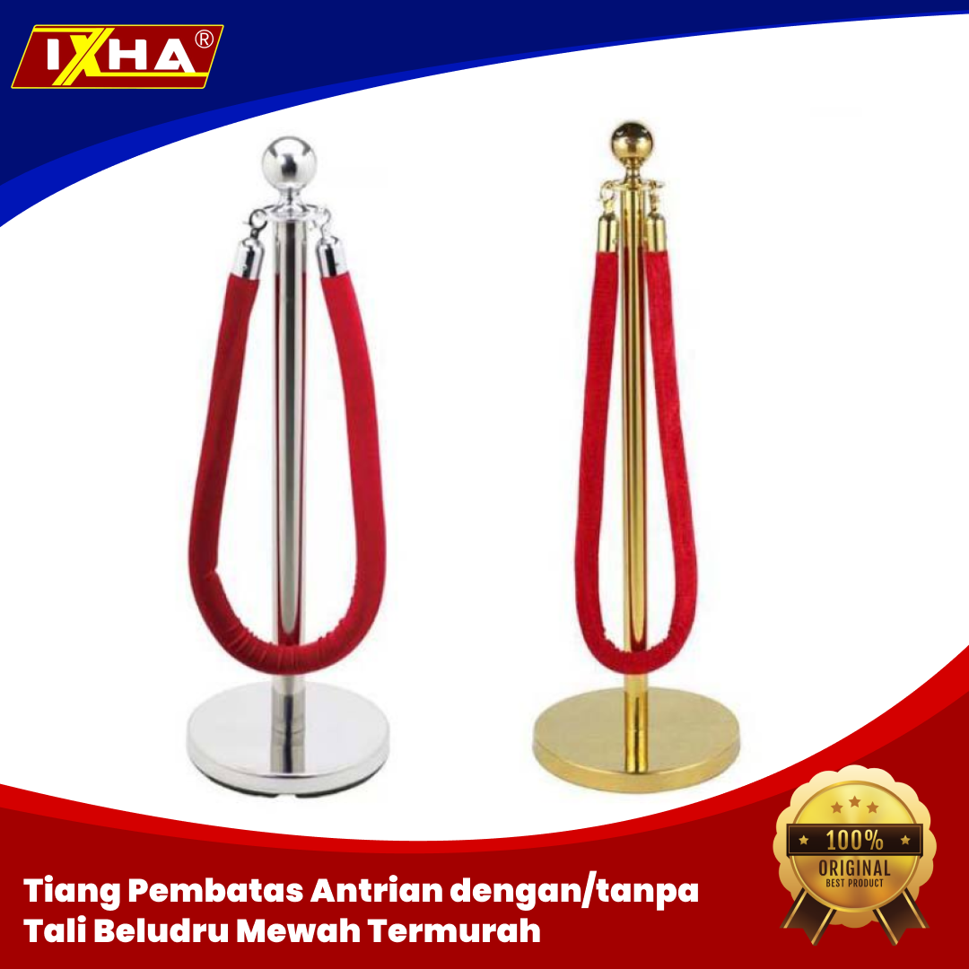 Barrier stand atau tiang antrian Stainless dengan tali beludru ini memilki warna gold serta Silver dan dilengkapi pengait untuk mengaitkan tali tersebut.
