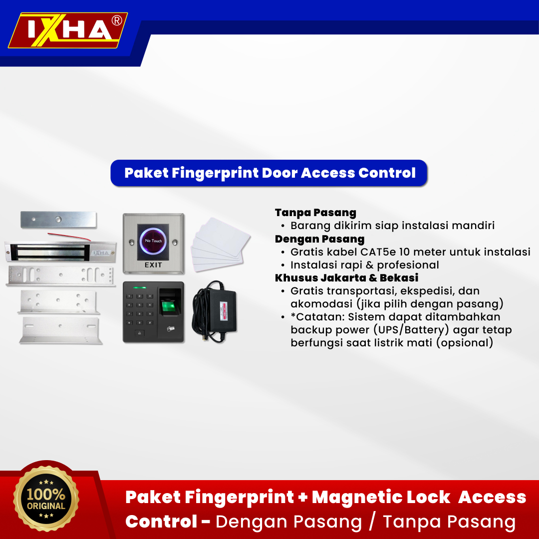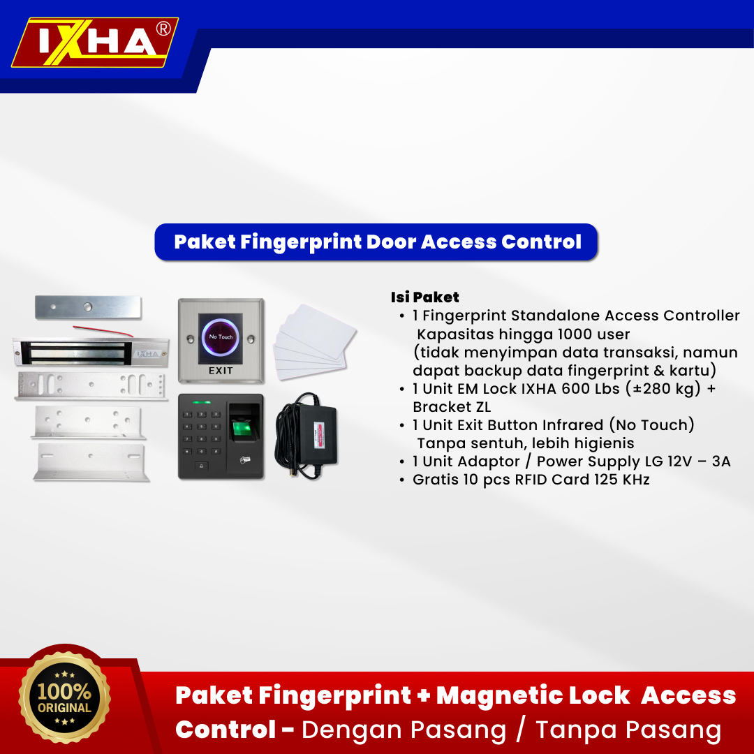 Paket Fingerprint Door Access Control Termurah Kapasitas Besar 1000 User Menggunakan em Lock untuk Pintu Kayu atau Alumunium (dengan kusen alumunium , kayu atau tembok) Buka Pintu pakai Fingeprint , Kartu RFID atau PIN Jenis Kartu : RFID EM Card/TK4100 125KHz Paket terdiri dari : – 1 unit Fingerprint Standalone Access Controller 1000 user ( tidak ada data Transaksi tersimpan tapi bisa backup data finger dan kartu ) – 1 unit EMLock IXHA 600 Lbs 280 kg dan Bracket ZL – 1 unit Exit Button INFRARED NO TOUCH – 1 unit Adaptor LG Power Supply 12V / 3A – Gratis 10pcs RFID Card 125 KHz Ada Pilihan : Tanpa Pasang dan Dengan Pasang jika dgn Pasang free kabel cat5e 10 meter untuk Instalasi jika ingin tetap bisa Di gunakan saat mati lampu khusus Jakarta amp; Bekasi Free Transportasi, Ekspedisi dan Akomodasi jika pilih dengan Pasang
