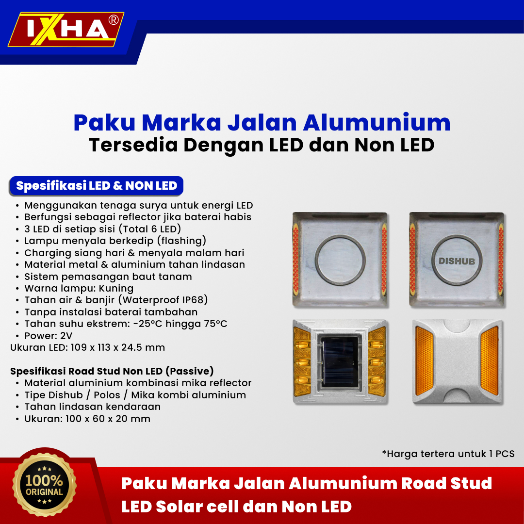 Road Stud Atau biasa di sebut marka jalan atau Mata Kucing atau Reflector jalan yang biasa di pasang di jalanan agar dapat merefleksikan cahaya sehingga bisa di lihat pada malam hari atau keadaan gelap gulita. Road stud yang berada di pasaran merupakan road stud passive yang harus membutuhkan pantulan cahaya agar terlihat. Road Stud kami mengunakan tenaga surya (Solar Cell) yang active menyimpan energi pada saat siang hari dan mengeluarkan cahaya pada saat malam hari sehingga sangat aman untuk di pasang di jalan yang gelap sekalipun atau sebagai penanda jalan. Spesifikasi : – Mengunakan tenaga surya untuk menyalakan lampu LED serta fungsi passive apabila batre yang tersimpan habis masih dapat terlihat mengunakan bantuan cahaya. – Mengunakan 3 LED di setiap sisi (Total 6) – Bahan Metal dan tahan lindasan kendaraan – Bahan Aluminium – Mengunakan sistem baut tanam – Terdapat warna lampu : Kuning – Anti Air dan banjir (WateprooF IP68) – Tanpa instalasi baterai – Lampu menyala berkedip – Working Mode Charging at day and lighting at night automatically – Heat Resistance -25~75 – Power : 2V Ukuran : 109x113x24.5mm ( led) 100x60x20mm ( non led dishub, polos dan mika kombinasi alumunium )
