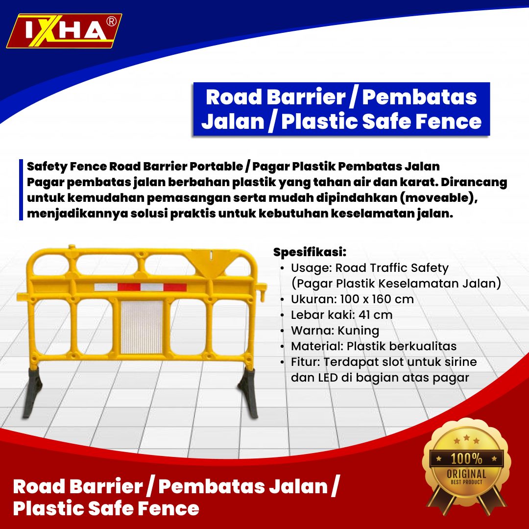 SAFETY FENCE ROAD BARRIER PORTABLE PAGAR PLASTIK PEMBATAS JALAN MURAH Pagar pembatas jalan berbahan plastik, anti air dan tahan karat, pemasangan sangat mudah dan moveable. Spesifikasi : Usage : Road Traffic Safety Pagar Plastik Keselamatan Jalan Ukuran : 100 x 160 cm lebar kaki 41 cm Colour : Yellow Material : Plastik Terdapat slot sirine dan LED di bagian atas pagar Aplikasi : Jalan raya,perumahan dll